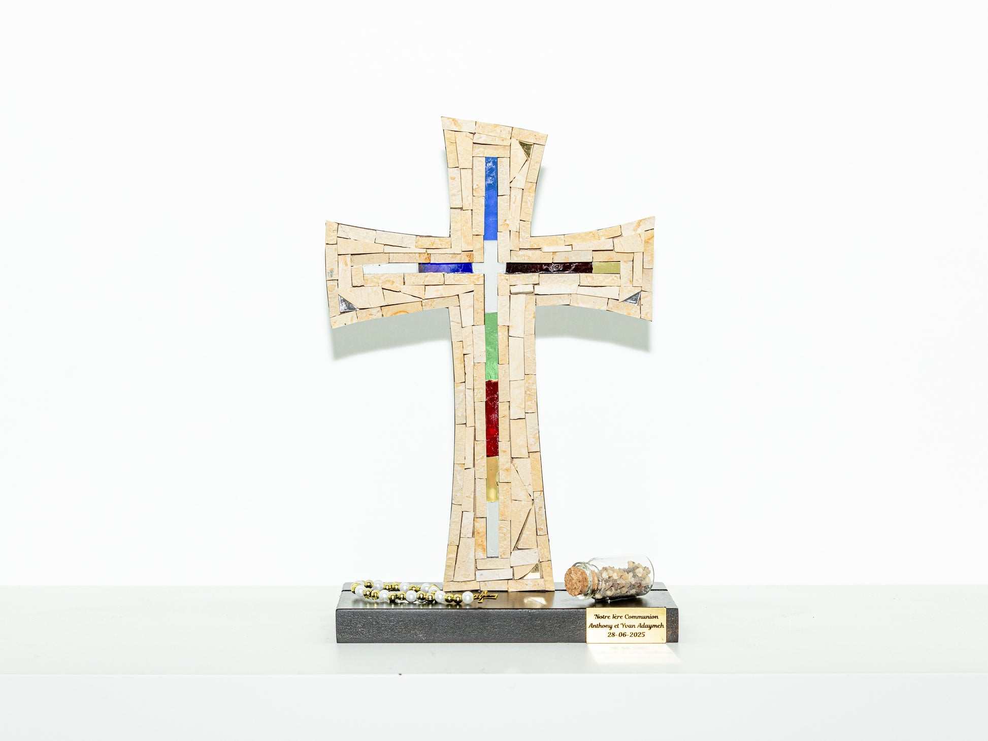 A handcrafted mosaic cross made from natural stone and colored vitrail glass.