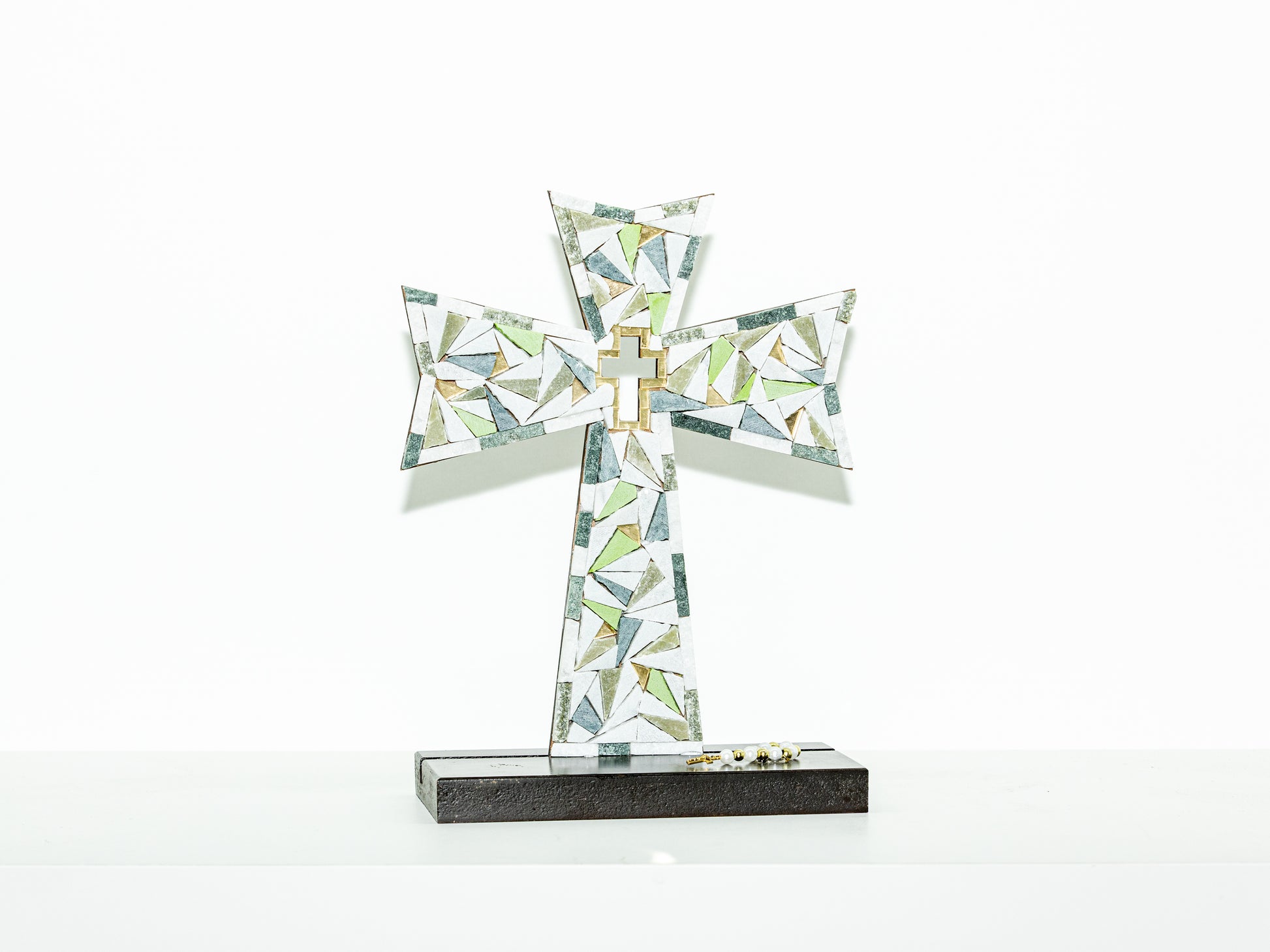 Its unique, stylized silhouette features slightly flared ends, giving it a classic, Patriarchal feel, perfectly suited for modern home decor.