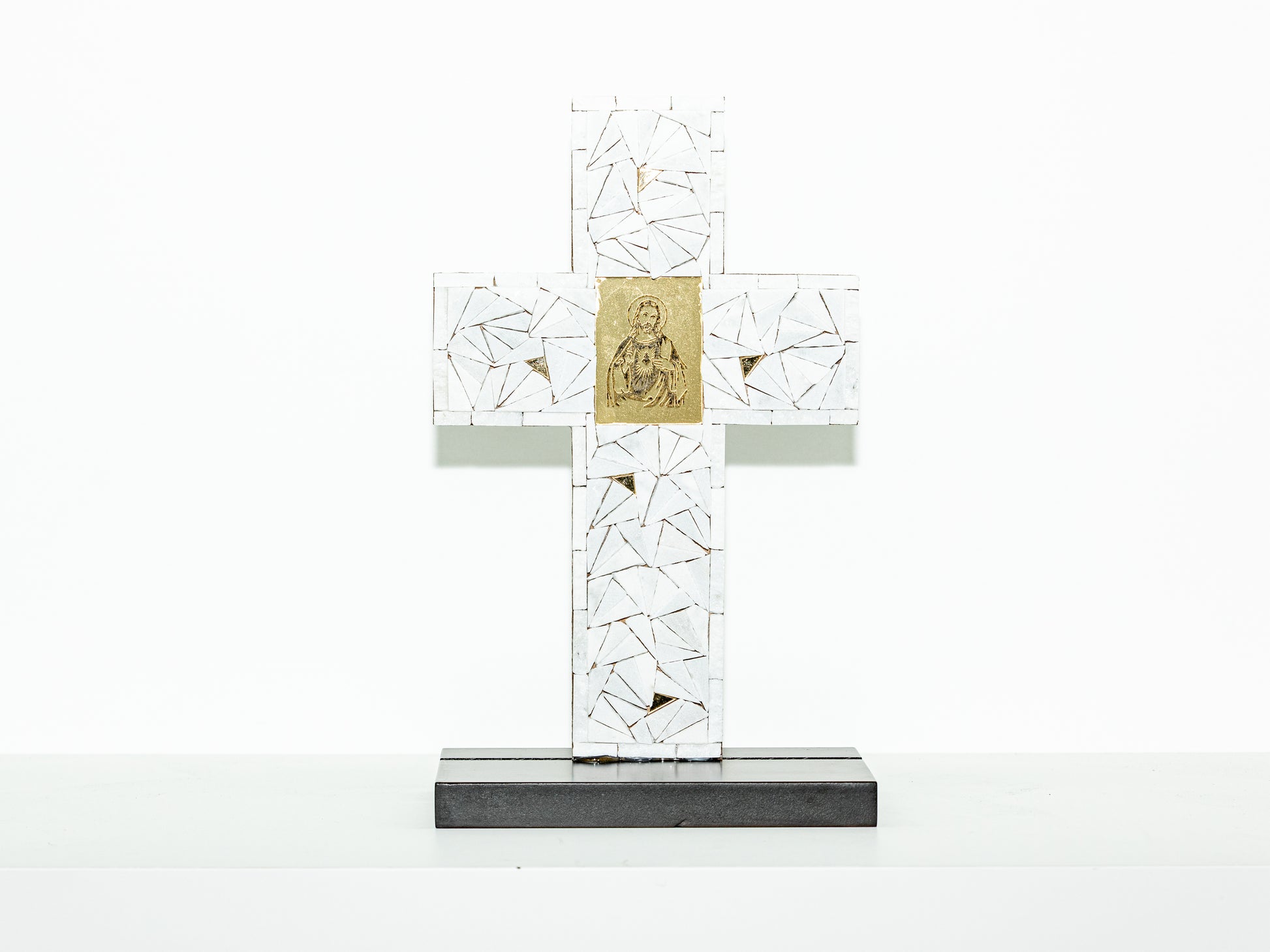 The purity of the white mosaic serves as a powerful backdrop to the central feature: a beautifully detailed, gold-toned metal icon of Christ.