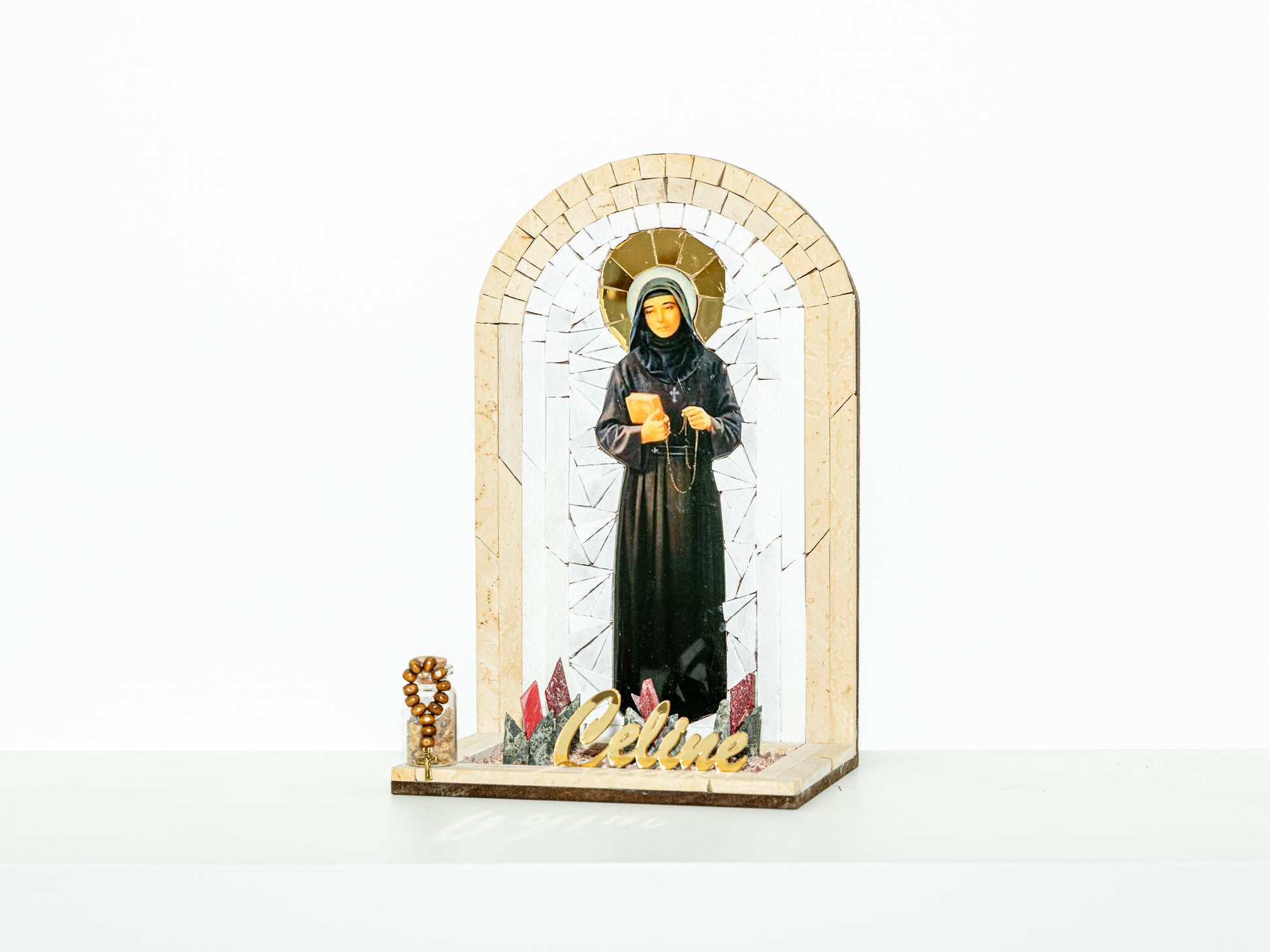 The image is set within an elegant, rounded mosaic arch. The frame is distinctively bordered with natural-toned stone, giving the shrine a rustic yet reverent feel. The base of the arch also features coordinating mosaic pattern.