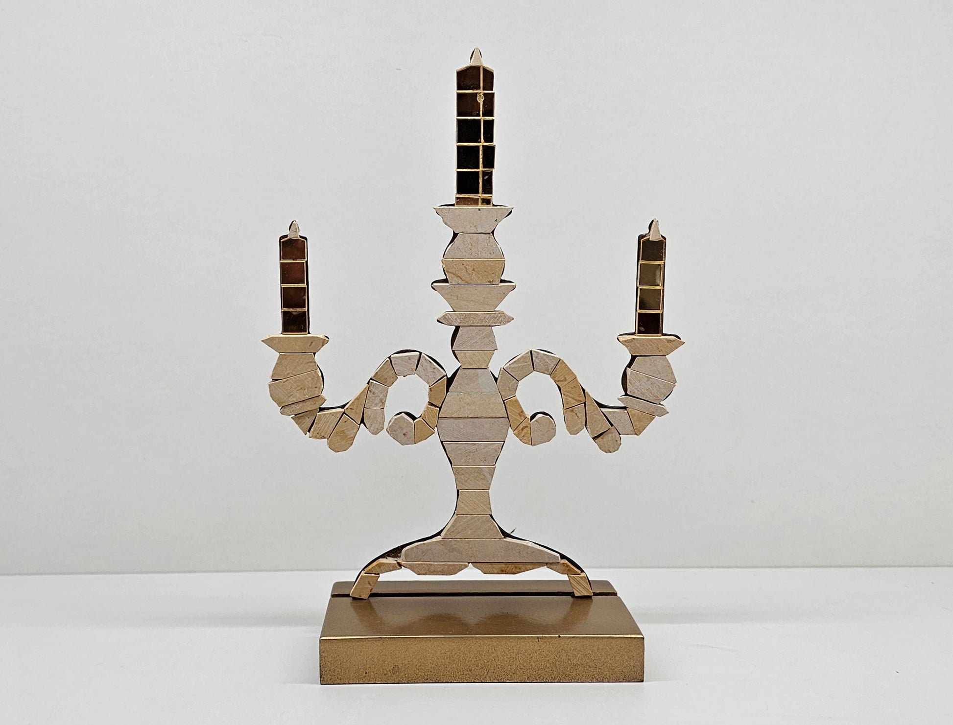 Elevate your décor with this sophisticated three-arm candelabra sculpture. Crafted from meticulously cut and pieced neutral mosaic stone, this piece recreates the classic shape of a three light candlestick in a unique mosaic style.