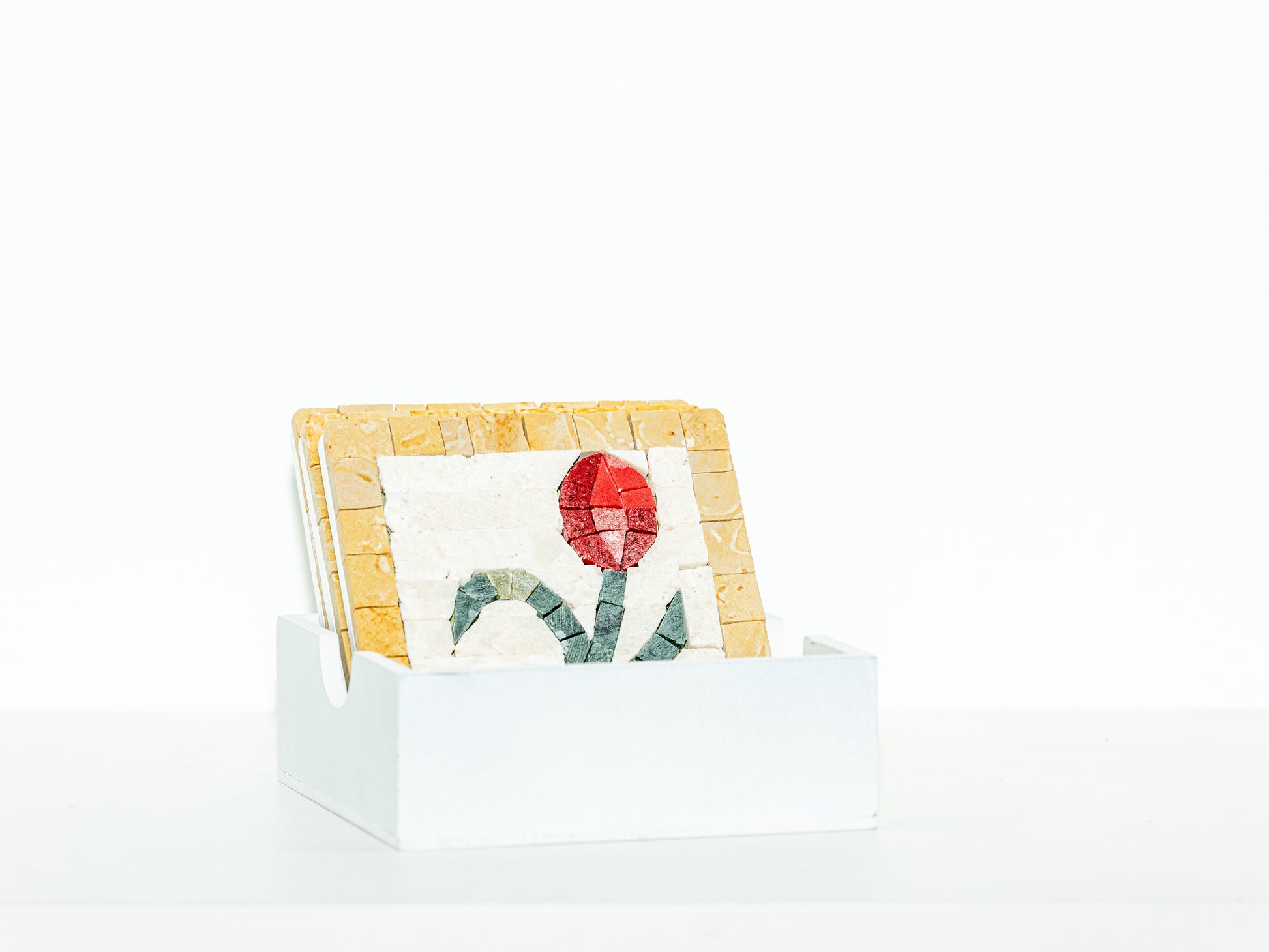 This functional and decorative set includes four square coasters and a neat white wooden holder for convenient storage. Each coaster features an eye-catching, artisanal design handcrafted with mosaic stones.