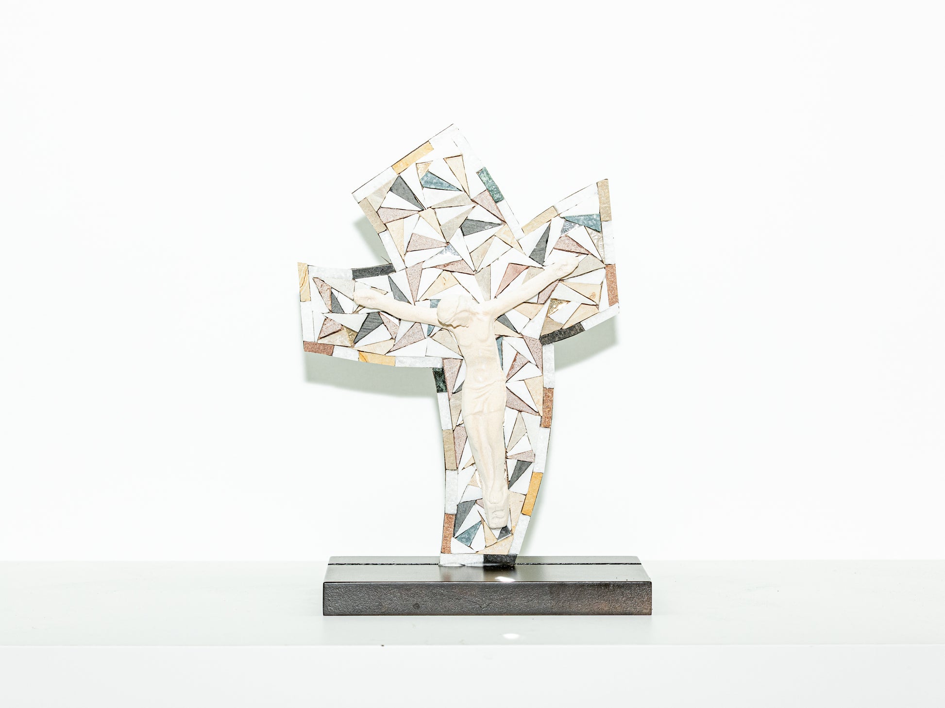 Devotional art that blends natural textures with profound spiritual meaning. Its unique, stylized cross shape is adorned with a mosaic of hand-cut natural stone.