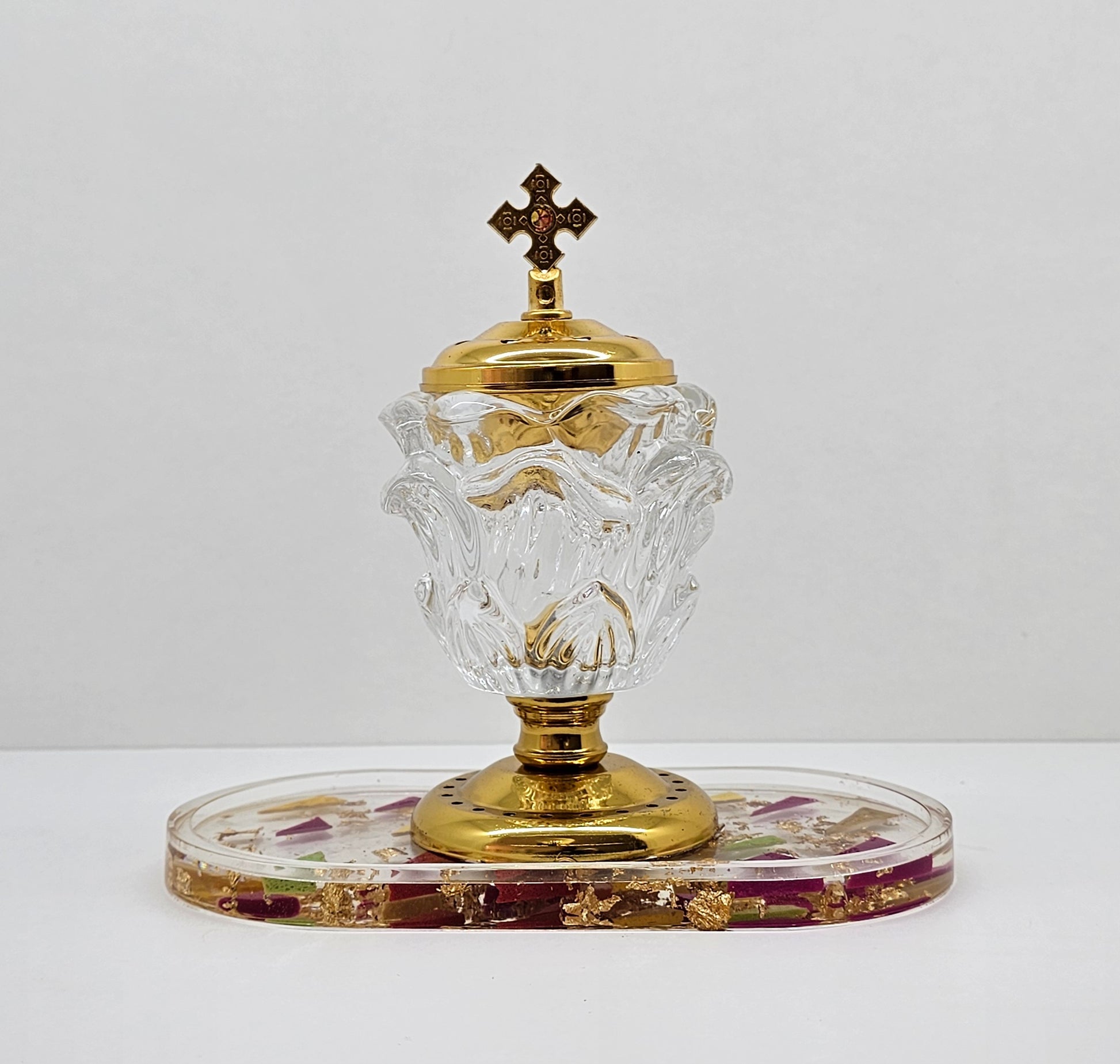 An exquisitely crafted devotional censer or reliquary that brings elegance to any prayer corner or altar. The piece features a delicately carved crystal body set within a radiant gold-tone metal base and lid, fixed on a resin with mosaic accents tray.